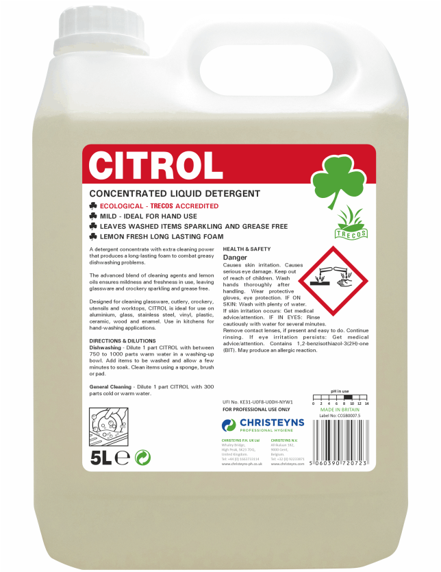 A concentrated washing-up liquid for hand use. Citrol produces long-lasting foam to combat greasy dishwashing problems. The advanced blend of cleaning agents and lemon oils ensures mildness and freshness in use, leaving glassware and crockery sparkling and grease free. Designed for cleaning glassware, cutlery, crockery and utensils by hand.