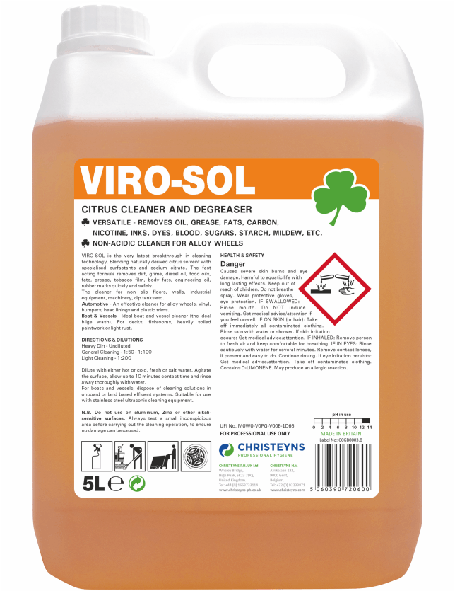 Viro-sol is fast-acting to remove even the most stubborn soiling, including diesel oil, food oil, fats, grease, tobacco film, body fat, mineral oils, rubber, traffic film and engineering oil.